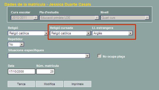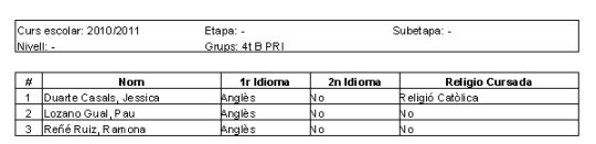 Per fer la comprovació es pot imprimir una llista configurable per matrícula amb els valors: religió, primera llengua estrangera i segona llengua estrangera. |