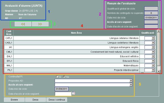 | Aquest resum l'emplena automàticament el programa en clicar, [Desa], [Desa i continua] o alguna de les fletxes per canviar a l'alumne anterior o següent. | |