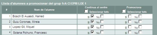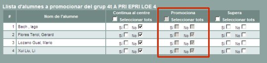 NOTA: Els xecs de la columna Promociona estan, per defecte, tots desmarcats. Clicant el camp Seleccionar tots de la capçalera, es marquen tots amb l'opció Si, després cal modificar el valor en els alumnes que correspongui, si és el cas. |