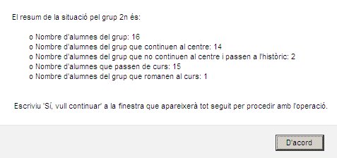 | Cliqueu al botó [D'acord] i el programa us mostrarà el resum de la promoció del grup: | |