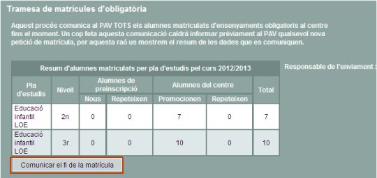 | Premeu els botons [Comunicar el fi de la matrícula] de cada pla d'estudis | |