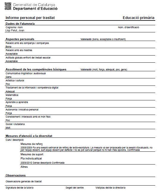 | Aquest informe s'ha d'emplenar per a tots els alumnes que finalitzen l'etapa i s'ha de lliurar, juntament amb la còpia de l'historial acadèmic, al centre on l'alumne es matriculi a fer ESO, a petició d'aquest. | |