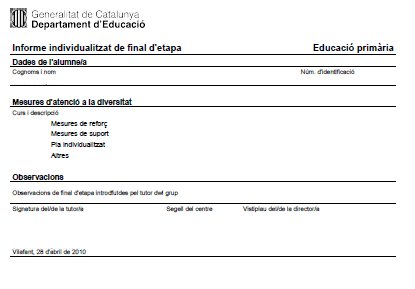 L'informe individualitzat de final d'etapa està format per dues pàgines, la primera de les quals conté: