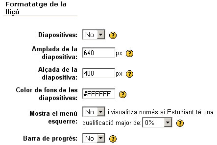 A Formatatge de la lliçó, podeu optar per presentar la lliçó com a diapositives de mides determinades i amb un color de fons adient. Les pàgines que es presentaran en aquest format són les taules de ramificació; les preguntes, però, surten d'aquest format i es presenten en el format normal. Són útils per donar informació perquè presenten els botons de Següent i Anterior per anar-les passant.