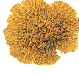 Talo foliáceo con lóbulos planos en algunos casos pequeños (1-2 mm). Tiene numerosos apotecios de color amarillo anaranjado. Se encuentra en toda Europa, sobre corteza, madera y rocas.