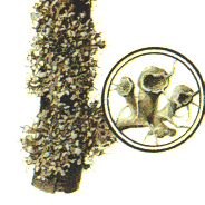. Esta especie crece muy bien en ambientes polvorientos. Los pequeños lóbulos blancos del talo se superponen, formando una especie de césped. Las terminaciones del talo contienen los sorelios planos.