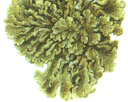 caperata Tienen unos lóbulos anchos con Soralios verde amarillentos, granulares y situados en la parte central, en ocasiones excepcionales presenta grandes apotecios en forma de disco de color pardo rojizo y con un reborde prominente.
