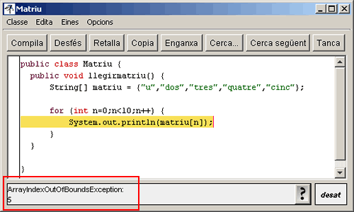 El BlueJ ens informa d'una excepció del tipus ArrayIndexOutOfBoundsException |
