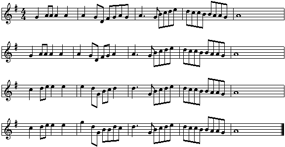 In this English song, with the file name GOODMORN use the notes F, Bb and C with long values of half and whole notes.