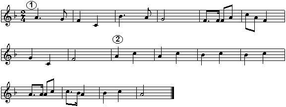 - Copiad en la pantalla la canción siguiente. Una vez la hayáis escuchado, escribid una 2a y 3a voz en forma de canon (textura polifónica). Los números en circulo indican donde han de empezar las voces. Por tanto, tenéis que completar el principio de la 2a y la 3a voz con silencios.