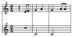 - Recuperad la melodía que lleva por nombre de fichero RUQUET. fijadle el tiempo en "Allegretto" Añadidle una 2a voz de acompañamiento en textura armónica. Para hacerlo, utilizad solamente las notas do y sol en valores de blancas (una por compás).