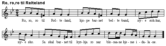Ro, ro, ro til Relteland, kjope barnet belteband, nye sokkar, nye sko. Sa skal barnet til kyrkja ro nar blomane kjeme i dalane.