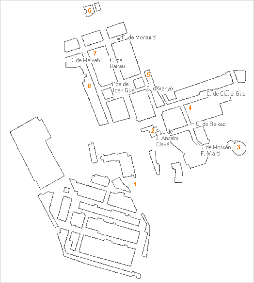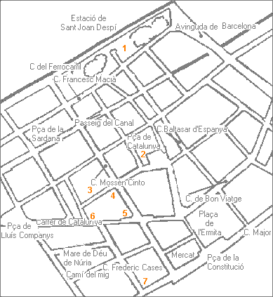 Els nuclis més importants d'arquitectura modernista a la comarca són la Colònia Güell i Sant Joan Despí. Per aquest motiu es proposa un itinerari per cada una d'aquestes poblacions. La Colònia Güell té dues parts interessants per visitar: el recinte industrial i la part residencial. En entrar a la colònia, a mà esquerra, trobem els diferents tipus d'edificis industrials on es realitzaven els diversos processos per a la producció del teixit. Tipològicament els edificis més interessants són el de pisos, on es transformava el cotó en fil, el de dents de serra, on es teixia la roba, i els assecadors, on s'eixugava la roba un cop tenyida, els quals són particularment interessants per la disposició dels maons. Un cop visitada la fàbrica ens endinsarem a la part residencial on podrem observar el primer edifici que trobem, Ca l'Ordal, una cosa construïda com habitatge dels pagesos de la colònia que és interessant per les filigranes del maó. Després pujarem pel carrer Reixac i trobarem l'edifici més admirat de la colònia, la cripta d'Antoni Gaudí del qual tant l'exterior com l'interior són molt singulars. Continuarem la ruta fins a la Cooperativa de Consum al carrer Claudi Güell, on el maó també és el protagonista. Tot seguit passarem per l'antic Centre Parroquial de Sant Lluís, que segueix també l'estètica modernista, i arribarem a l'Escola i Casa del Mestre, units per un pont. Seguirem la ruta passant per Ca l'Espinal on destaca una tribuna construïda aprofitant la ubicació de l'edifici en cantonada. Tornarem al punt inicial de la visita passant pel carrer Malvehí, on trobarem el conjunt més interessant de cases dels antics obrers de la fàbrica. Pel que fa a Sant Joan Despí, hi trobem també un patrimoni destacable, obra de l'arquitecte Jujol. El primer edifici arquitectònicament interessant i el primer que Jujol va realitzar a la població és la Torre de la Creu, molt curiós per les cúpules que el coronen. També és mereixedor d'una visita Can Negre, tant a l'exterior com a l'interior. Molt a prop d'aquí trobem altres tres cases remarcables, la Torre Serra Xaus, la Torre Jujol i la Casa Rovira, tant per la seva estructura arquitectònica com pels seus esgrafiats. Dels altres edificis de la població en què va intervenir Jujol són sobretot destacables els seus esgrafiats. Els més significatius són els angelets de la casa número 4 del carrer Frederic Cases i el Sant Antoni de la casa núm. 26 del carrer Catalunya. No cal oblidar la decoració interior de l'església parroquial i la fàbrica de cartró als afores del poble. Itinerari per Sant Joan Despí ![]() ![]() 1 Torre de la Creu (1913-1916) -- 2 Can Negre (1915-1930) -- 3 Torre Jujol (1932) -- 4 Torre Serra Xaus (1921) -- 5 Casa Rovira (1926) -- 6 Casa del Carrer Catalunya, 26 (1929) -- 7 Casa del Carrer F. Cases, 4 (1931) Itinerari de la Colònia Güell ![]() ![]() 1 Fàbrica -- 2 Ca l'Ordal -- 3 Cripta -- 4 Cooperativa de Consum -- 5 Centre Parroquial Sant Lluís -- 6 Escola i Casa del Mestre -- 7 Ca l'Espinal -- 8 Cases dels Obrers |