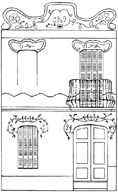 La façana representada al dibuix correspon a un edifici del carrer Pi i Margall de Sant Boi de Llobregat. Consta de planta baixa, pis i terrat pla. La finestra i la porta de la planta baixa són d'arc carpanell i per sobre tenen una ornamentació d'esgrafiats florals. El pis queda separat per una línia de cornisa i té una balconera i una finestra cega, ambdues amb una llinda ondulada on apareix l'esgrafiat d'una flor. La part baixa d'aquest pis està ornamentada amb una faixa ondulada. L'edifici es corona amb un ampit de línies sinuoses amb esgrafiats amb motius florals i la data de construcció.