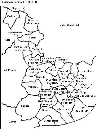 - Un element estructurador de la comarca del Baix Llobregat és el riu que li dóna el nom. Pinta'l en el mapa i digues quins municipis queden a la dreta i quins a l'esquerra del riu.