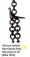 elements corrents en les excavacions arqueològiques. Solen ser de bronze i poden portar alguna decoració, com ara perles de corall. Les portaven tant les dones com els homes i la seva grandària depenia del gruix del gènere tèxtil que havien d'aguantar. La fíbula ibèrica més típica és l'anomenada fíbula anular, de forma rodona, que s'utilitzarà entre els segles V i I a.n.e., cinc-cents anys sense passar de moda (tot un èxit!). A partir d'aquest moment, les fíbules desapareixen, innecessàries per la nova moda introduïda pels romans, la toga. |