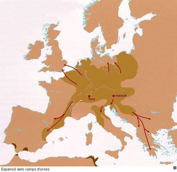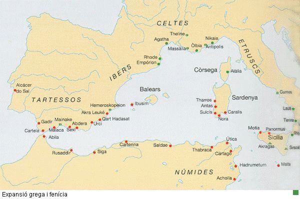 La formació de la civilització ibèrica Als voltant de l'any 1000 a.n.e., gent vinguda de l'altra banda dels Pirineus que parla una llengua indoeuropea i que coneix la metal·lúrgia del ferro, pel seu origen a la zona danubiana, a Centre Europa, es superposa sobre el substrat indígena del país, amb una cultura material del bronze i que no havia rebut aportacions estrangeres, sent, de fet, una pervivència de la població prehistòrica, la neolítica. ![]() A més de la llengua, aquesta gent centre europea porta un nou ritual d'enterrament, la incineració o cremació dels cadàvers, les cendres dels quals es col·locaran directament a terra dintre d'urnes de ceràmica, fet pel que rebran el nom de "pobles dels camps d'urnes". De tota manera, cal matitzar que la metal·lúrgia del ferro s'introduirà d'una manera molt lenta, i no la tenim plenament implantada fins al segle VI a.n.e., quan ja no només s'utilitza per a objectes de prestigi, sinó també per a instrumental agrícola i altres eines d'ús quotidià; aquesta àmplia difusió està relacionada amb la presència de comerciants grecs a la zona empordanesa. El bronze quedarà destinat als objectes de tocador, com les navalles, o d'ornament i ús quirúrgic. El canvi en la cultura material es deixarà sentir també en les formes i decoracions ceràmiques; les urnes solen tenir formes bicòniques, amb el cos carenat o arrodonit i porten tapadores en forma de plat de base plana. La decoració és a base d'acanalats, cordons decorats sobreposats i motius geomètrics incisos.Les cases dels nous vinguts són cabanes excavades en el sòl i amb coberta de fusta i argila sostinguda per pals clavats a terra, tenen petites dimensions i poden ser de planta oval o rectangular. Ara bé, amb l'arribada del poble dels camps d'urnes no n'hi hauria prou per explicar la formació de la cultura ibèrica. Un fet tan o més trascendent són els frequents viatges comercials que per les mateixes dates comencen a fer a les nostres costes els pobles navegants de la Mediterrània oriental, fenicis i grecs, o central, els etruscs. ![]() Decisiva serà la fundació de la colonia focea d'Empúries, al Golf de Roses, vinculada a la factoria de Marsella (Massalia), del mateix origen, al voltant del 600 a.n.e.. Amb anterioritat, els grecs de l'illa de Rhode havien fundat la ciutat del mateix nom una mica més al nord, on avui hi ha la ciutat de Roses.