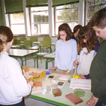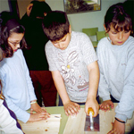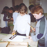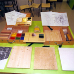 | Material: | Guia didàctica per als mestres, quadern dels alumnes,  diferents tipus de fustes, cola de conill, pa d'or, terres de colors, pinzells, punxons, etc., col·lecció de diapositives. |