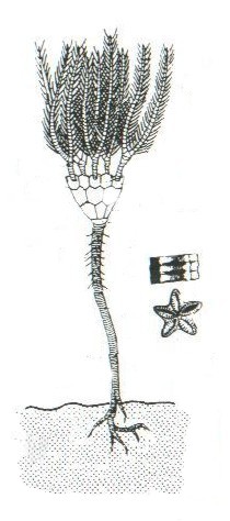Dibuix del crinoideu 'Pentacrinus neocomiensis' amb detall de 'l'estrelleta' i 'pilonet'