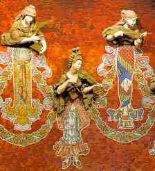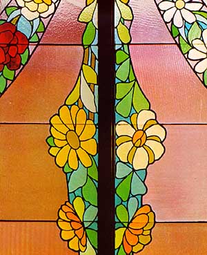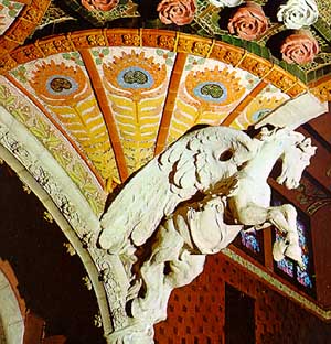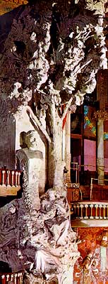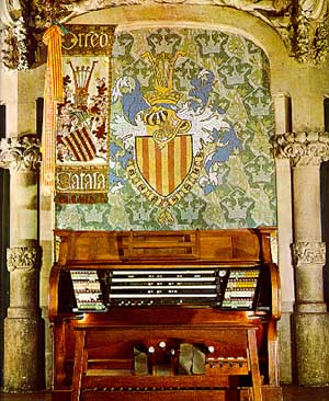 A la dreta hi ha unes columnes dòriques, amb el bust de Beethoven; d’uns nùvols que pujen surt la cavalcada de les Walquíries (de Wagner). Dalt, al mig de l’arc, com una pedra clau, hi ha l’escut del Palau de la Música Catalana. L’escenari té l’arrambador groc i un balcó, com el del segon pis, amb seients, on s’hi encasta l’orgue: té els tubs, ben drets, en set feixos i un sòcol de fusta tallada, on hi ha nens jugant; al fons d’aquesta part alta hi ha uns arcs i vitralls. A la part de baix de l’escenari hi ha un fris de mosaic corbat que representa dones inclinades que toquen diferents instruments: són les muses de la Música. El fons de la paret és de trencadís vermell, gran, de tons variats; les dones tenen cap i cos esculpit i les faldes fetes amb mosaic petit, totes diferents.Al mig, sota l’orgue, hi ha unes portes, la senyera, com la de l’Orfeó, feta en mosaic, i hi havia la consola de l’orgue. La sala té bona sonoritat per a la música tradicional, que no usa amplificadors, especialment als primers rengles de l’amfiteatre i segon pis on, quan hi ha un tutti, es sent com un corrent, suau però ben viu. |