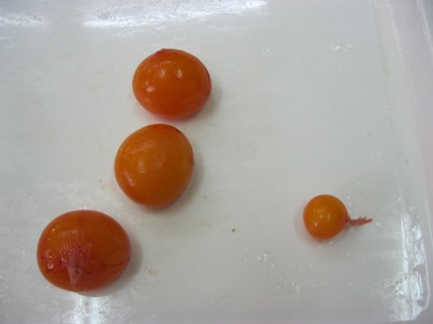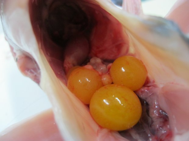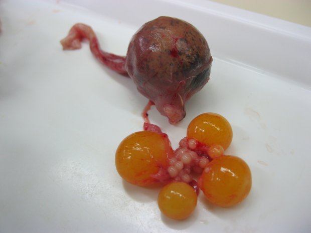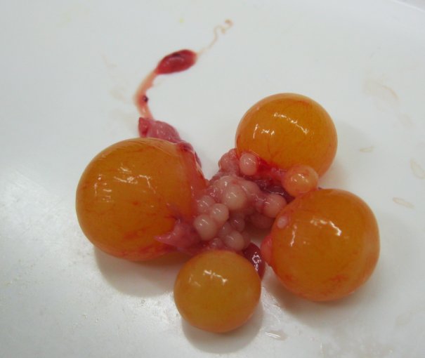 ELS ÒVULS ESTAN ENVOLTATS D'UNA MEMBRANA QUE ELS PROTEGEIX. ENCARA NO TENEN LA CLARA. AQUESTA S'HI FORMARÀ MÉS ENDAVANT.