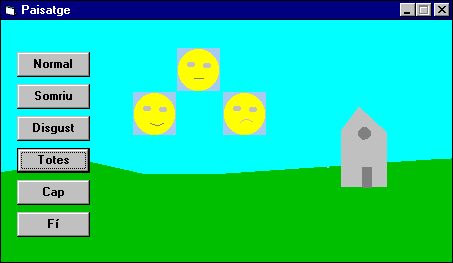 Podeu veure que en el codi anterior, el procediment associat al botó cmdDisgust fa visible la imatge corresponent a una cara disgustada. Anàlogament, els botons cmdNormal i cmdSomriu fan el mateix amb la cara respectiva. Finalment, el procediment cmdTotes les mostra totes i estableix el lloc on es visualitzaran.