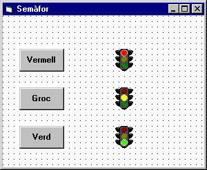 E1. Simuleu un semàfor. Afegiu tres botons de comandament que mostraran els tres estats possibles d’un semàfor. Els gràfics del semàfor són a: C:\VBCurs\VBHtml\vibam1\m1p2 (TRFFC10A.ICO, TRFFC10B.ICO, TRFFC10C.ICO). Copieu aquests fitxers en el vostre directori de treball C:\VBCurs\VBExerci\m1\p2.