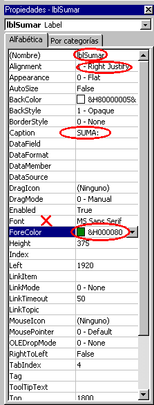 Mostrem la finestra properties de l'etiqueta, lblSumar, indicant-hi quines són les que canvien. ![]() En els objectes anteriors hi apareixen unes propietats noves comentades tot seguit: La propietat Alignment és utilitzada per determinar el tipus de justificació de text que es vol aplicar en l'objecte en què s'ha definit. La propietat Font, fa obrir un quadre de diàleg que permet escollir el tipus de font (Fuente), l'estil (Estilo de fuente), la grandària (Tamaño) y si es tracta d'una font taxada o subratllada (Efectos), de la font de text utilitzada en l'objecte en què s'ha definit. La propietat ForeColor estableix el color de la font de text utilitzada en l'objecte en què s'ha definit. Fase de programació de respostes a eventsTal com es pot preveure segons la fase de disseny anterior, hi haurà d'haver resposta als clics del ratolí sobre els botons. Per tant, cal escriure els procediments d'event Click per a cada un dels botons. Recordeu que això es fa, en mode de disseny, clicant dues vegades el botó al qual se li vol associar el codi de programa depenent d'un event i, en sortir la finestra de definició de codi, escollir l'event desitjat. En aquest cas, els procediments seran:Recordeu que per obrir la finestra d'edició de codi podeu fer-ho fent un doble-clic en el botó corresponent. Botó Sumar
