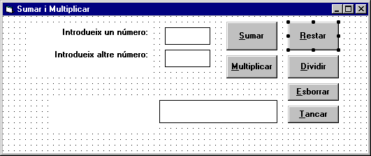 Fitxer formulari m1p3e1.frm Fitxer executable m1p3e1.exe Per a qui no en tingui prou Exercici optatiu. E2. Afegeix l'operació resta i l'operació quocient al formulari de l'exercici anterior. Cal anar en compte en el quocient que no es pot dividir per 0 i si el divisor ho és, el programa es penjarà. Per solucionar aquest problema mireu la instrucció if en les pràctiques posteriors. m1p3e2. La finestra principal del programa en mode edició ha de quedar més o menys així: ![]()