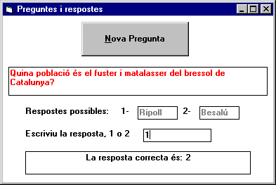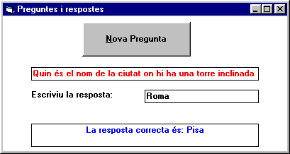 Fase de programació de respostes a eventsCal declarar les variables i procediments que inicialitzen els valors de la matriu que conté les preguntes i les respostes:Declaracions generals d'àmbit el formulari principal: Declaracions de variables: Dim matriuPreguntes(3, 2) As String Dim m As Integer Procediments: Sub IniciaMatriuPreguntes () matriuPreguntes(1, 1) = "Quin és el nom de la ciutat on hi ha una torre inclinada molt famosa?" matriuPreguntes(1, 2) = "Pisa" matriuPreguntes(2, 1) = "Quants dies té un any de traspàs?" matriuPreguntes(2, 2) = "366" matriuPreguntes(3, 1) = "Quin mes se celebra Sant Jordi?" matriuPreguntes(3, 2) = "Abril" End Sub Mètodes associats a l'event Load Per al formulari principal: Sub Form_Load () IniciaMatriuPreguntes 'Aquesta és la crida al procediment definit anteriorment txtPregunta.Visible = False lblResposta.Visible = False txtResposta.Visible = False txtAvaluacióResposta.Visible = False End Sub En obrir el formulari, es donen valors als components de la matriu i s'amaguen tots els botons llevat del botó de comandament: Observeu la crida al procediment IniciaMatriuPreguntes declarat d'àmbit general a tot el formulari principal. Mètodes associats a l'event Click Per al botó cmdNovaPregunta: Sub cmdNovaPregunta _Click () txtAvaluacióResposta.Visible = False Randomize m = Int(3 * Rnd + 1) txtPregunta.Text = matriuPreguntes(m, 1) lblResposta.Visible = True txtPregunta.Visible = True txtResposta.Visible = True txtResposta.SetFocus txtResposta.Text = "" End Sub S'escull una pregunta a l'atzar i es presenta en la caixa de text txtPregunta. Els altres controls es fan visibles. Podeu observar que l'expressió m = Int(3 * Rnd + 1) serveix per establir, de manera aleatòria, la pregunta escollida ja que el valor d'aquesta expressió adopta un valor entre 1 i 3 (ambdós inclosos). Per altra banda, la instrucció txtResposta.SetFocus té la finalitat de situar el cursor a la caixa de text i fer que aquesta tingui el focus, és a dir, que estigui activada. Mètodes associats a l'event KeyDown Per a la caixa de text txtResposta: Sub txtResposta_KeyDown (Keycode As Integer, Shift As Integer)