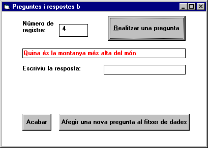 La lectura de la pregunta escollida aleatòriament i de la pregunta corresponent es fa mitjançant la instrucció Get que té tres paràmetres: #1 (el fitxer), m (el número de registre a llegir) i Preg (el registre en el qual s'emmagatzemaran les dades obtingudes del fitxer). Per al botó Afegir pregunta: Sub cmdAfegir_Click ()