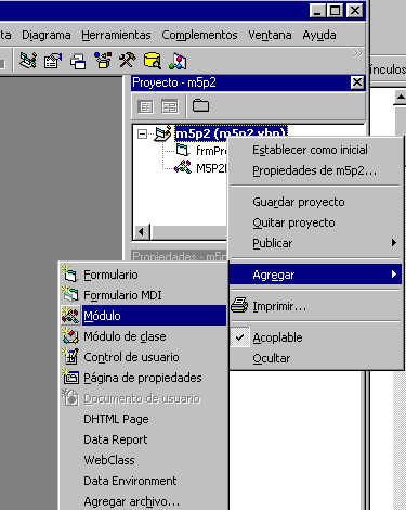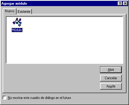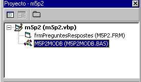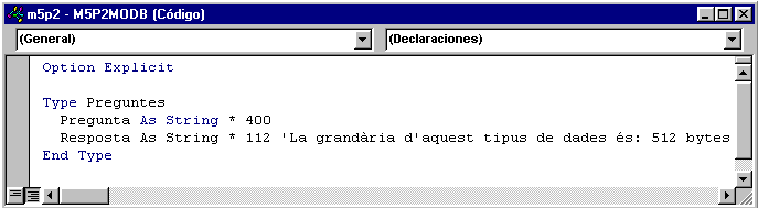 Fase de programació de respostes a eventsDeclaracions globals a tot el programaCom les dades s'emmagatzemaran en un fitxer cal fer algunes definicions i declaracions noves. Creeu doncs un nou mòdul. Per fer-ho cliqueu amb el botó dret damunt de la finestra de proyecto i s'obrirà un menú contextual. Cliqueu en la opció, Agregar i es deplegarà un nou submenú. Cliqueu en la opció, Módulo. ![]() Apareixerà un nou quadre de diàleg on cal clicar Abrir. ![]() per tal de posar-hi la definició d'un nou tipus de dades del qual heu de fer-ne ús i deseu-lo amb el nom m5p2ModB.BAS: ![]() I escriviu-hi en el lloc de les declaracions generals. ![]() Type Preguntes Pregunta As String * 400 Resposta As String * 112 'La grandària d'aquest tipus de dades és: 512 bytes End Type Aquesta declaració suposa que el fitxer que més tard declarareu i definireu estarà compost de dades estructurades en registres. Per exemple, el codi següent: Dim RegistrePregunta as Preguntes RegistrePregunta.Pregunta=" A quina població porten tots els camins?" RegistrePregunta.Resposta=" Roma" implica la declaració i l'assignació de dades a una variable estructurada RegistrePregunta que es compon dels dos camps Pregunta i Resposta. De manera gràfica, aquest registre es pot representar així:
