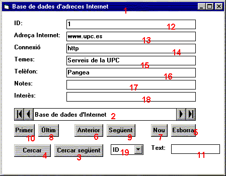 Per al botó Nou: Heu de pensar que això crea de manera provisional un registre a la pantalla. Si no s'escriu res, en moure's a un altre registre no es grava un registre buit. Sub cmNou_Click() datInternet.Recordset.AddNew End Sub Per als botons Cercar i CercarSegüent: En la cerca de dades cal especificar un Criteri de cerca d'informació, que és una condició formada per un camp i la informació que voleu trobar en aquest camp. Aquestes dues coses han d'unir-se pels operadors relacionals Like i =. Els mètodes de cerca d'informació són FindFirst, FindNext, FindPrevious i FindLast. Per exemple: datInternet.RecordSet.FindFirst " [Connexió] = 'http' " fa que el registre actual sigui el primer registre que és igual a http. datInternet.RecordSet.FindNext " [Temes] Like '*UPC*' " cerca el següent registre que conté la subcadena UPC. El codi adient per fer aquestes funcions de cerca és el següent: Declaracions globals al formulari: Dim Criteri As String Procediments de caire general: Sub cmdCercar_Click()
