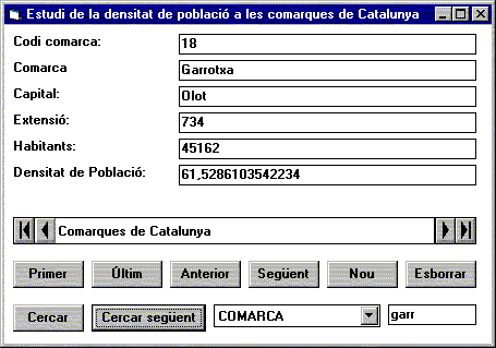 Mètodes associats a l'event Load Sub Form_Load() cboCamps.AddItem "ID" cboCamps.AddItem "Adreça" cboCamps.AddItem "Connexió" cboCamps.AddItem "Temes" cboCamps.AddItem "Telèfon" cboCamps.AddItem "Notes" cboCamps.AddItem "Interès" cboCamps.ListIndex = 0 End Sub Aquest procediment emplena els valors de la llista desplegable en la qual s'escull el camp en el qual s'ha de fer la recerca d'un text. Mètodes associats a l'event Key_Down Sub txtTextACercar_KeyDown(KeyCode As Integer, Shift As Integer) If KeyCode = 13 Then cmdCercar_Click End Sub Aquest procediment és equivalent a prémer el botó Cercar. S'executa en validar el text a cercar un cop s'ha premut la tecla RETORN. Nota: existeixen més utilitats del control de dades però una que pot tenir especial interès és la de fer Control de Transaccions. Una transacció és una sèrie de canvis que fareu a la base de dades però amb la possibilitat de desfer-los. ExercicisPer enviar al professor tutor. (Directori C:\VBCurs\VBExerci\m5\p3 )E1. A partir de la pràctica que acabeu de realitzar i utilitzant la base de dades COMARQUE.MDB, (Directori: C:\VBCurs\VBHtml\vibam5\m5p3) que conté una taula anomenada Característiques comarques per a presentar dades en un Data Control com en el formulari mostrat a continuació: ![]() Cal fer notar que l'últim quadre de text, "Densitat de població" no es correspon a cap camp concret de la taula de la base de dades. És un camp que l'heu de calcular a partir dels dos camps anteriors (densitat = habitants / extensió) i per actualitzar-lo, ho podeu fer utilitzant, per exemple, l'event change d'algun dels altres camps, per exemple el codi comarca. Cal enviar els següents fitxers: