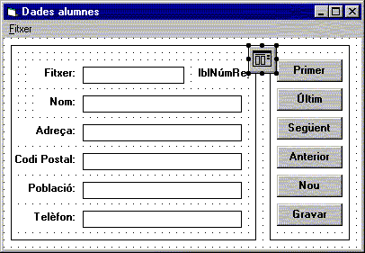 Pràctica optativaExecutar el programa m5p4.exe per conèixer el seu comportament. Veure el llistat del codi del programa, m5p4. Executar Visual Basic per editar el projecte (acabat): m5p4.vbp. Creació d'una base de dades d'alumnes amb un fitxer d'accés aleatoriEn activitats anteriors heu tractat dos tipus de fitxers: els fitxers d'accés seqüencial i els fitxers d'accés aleatori. En aquesta pràctica es tracten amb més èmfasi aquests últims. Recordeu, a més, que hi ha altre tipus de fitxers: els fitxers binaris, que també emmagatzemen dades però que no tenen necessàriament la mateixa longitud.L'activitat consisteix en crear un editor de fitxes de dades d'alumnes que permet crear, obrir o tancar un fitxer i que permet recórrer, editar i afegir registres a la base de dades. La finestra principal, en mode edició, ha de tenir un aspecte semblant al següent: ![]() El formulari principal serà semblant al mostrat anteriorment, amb un menú fitxer i amb les opcions de la figura petita: ![]() Fase de disseny de la interfície d’usuariObrireu un nou projecte com en la última pràctica del mòdul 3, és a dir, Controles de VB Edición Profesional que permetà fer servir un el control, CommonDialog , al directori C:\VBCurs\VBActivi\m5\p4 i amb el nom m5p4. Les propietats dels objectes que hi