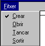 Mètodes associats a les opcions de menú El menú Fitxer té les opcions Crear, Obrir, Tancar i Sortir. Per tal d'obrir un fitxer podeu fer ús de l'eina CMDialog, però per crear un nou fitxer heu de demanar el nom a l'usuari, així com la unitat de disc i el directori. També heu de validar si un nom de fitxer nou ja existeix o no. Totes aquestes operacions no les fa el CMDialog. Per tant, heu de fer una finestra de diàleg que permetrà conèixer algunes eines noves semblant al mostrat aquí a sota. ![]() Aquest formulari nou, del qual s'especifiquen més avall les seves propietats, està lligat al menú Crear tal com s'esmenta a continuació en el procediment associat a l'opció de menú Crear: Mètode associat a l'opció de menú Crear Sub mnuCrear_Click ()
