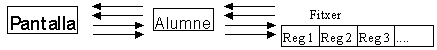 Els altres controls són etiquetes o quadres de dibuix que podeu incorporar de la forma que cregueu més oportuna. Fase de programació de respostes a eventsDeclaracions d'àmbit global a tot el projecteCreeu un nou mòdul que podeu anomenar m5p4mod.bas, quan el deseu, per tal d'afegir les declaracions de constants que seran utilitzades en el programa i que podeu consultar en el fitxer CONSTANTS.TXT del directori C:\VB. Afegiu també la declaració d'un nou tipus de dades per tal d'emmagatzemar provisionalment les dades d'un alumne a la memòria de l'ordinador mitjançant un registre: Global Const MODAL = 1 Global Const MB_OK = 0 Global Const MB_YESNO = 4 Global Const MB_ICONSTOP = 16 Global Const IDYES = 6 Global Const DLG_FILE_OPEN = 1 Global Const KEY_ESCAPE = &H1B Global Const KEY_RETURN = &HD Type AdrecesAlumnes Nom As String * 45 Adreça As String * 30 CodiPostal As String * 5 Població As String * 15 Telèfon As String * 12 End Type Global NomFitxerActual As String Global NomFitxerNou As String Fixeu-vos que cada registre de la base de dades té una longitud fixa de 107 caràcters. Les dues darreres variables serveixen per emmagatzemar el nom del fitxer en ús o el nom del fitxer nou que es vol crear, en el qual el disc i el camí (path) formaran part d'aquest nom. A més, es fa servir per saber si hi ha una base de dades oberta. Descripció del recorregut de dades de la pantalla al fitxer i del fitxer a la pantalla. Com veieu a la figura el recorregut de dades entre la pantalla i el fitxer es fa mitjançant una variable Alumne del nou tipus definit AdrecesAlumnes. ![]() És a dir, les dades que es visualitzen a la pantalla i que es llegeixen o es desen al fitxer fan servir un registre auxiliar, del tipus Alumne, que és l'encarregat de mantenir les dades de manera provisional a la memòria de l'ordinador. Declaracions de les variables globals a nivell del formulari frmAlumnes Les variables globals d'àmbit el formulari són: