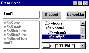 Codi de les llistes de frmFitxerCrear Mètodes associats a l'event Change en el formulari frmFitxerCrear El codi de la llista d'unitats actua quan l'usuari canvia d'unitat, i actualitza les altres dues llistes, la de directoris i la d'arxius. Sub drvDiscDestí_Change () On Error GoTo ErrDiscDestí dirDirectoriDestí.Path = drvDiscDestí.Drive dirDirectoriDestí_Change Exit Sub ErrDiscDestí: MsgBox "Hi ha un error de disc", MB_OK drvDiscDestí.ListIndex = AnteriorDrive Exit Sub End Sub El procediment anterior fa ús d'una variable global a nivell de formulari que guarda el nom de la unitat del disc anterior, per tal que si es produeix un error en el moment de canviar d'unitat torni a aparèixer el nom d'unitat d'acord amb els directoris i fitxers: Heu de definir d'àmbit el formulari Dim AnteriorDrive As String Sub dirDirectoriDestí_Change () ChDir dirDirectoriDestí.Path filLlistaFitxers.Path = dirDirectoriDestí.Path End Sub El codi de la llista de directoris actua quan l'usuari canvia de directori, i actualitza la llista d'arxius. Mètodes associats a l'event GotFocus Aquest event es dóna, per a un control determinat, quan l'usuari canvia de qualsevol lloc al control anterior. En aquest cas, Sub drvDiscDestí_GotFocus () AnteriorDrive = drvDiscDestí.ListIndex End Sub Codi auxiliar Per tal que aparegui el cursor en el quadre de text heu de fer que el quadre tingui el focus quan es carrega el formulari: Sub Form_Activate () txtNomFitxer.SetFocus End Sub També heu de fer que les tecles Esc i Retorn funcionin de forma adient quan l'usuari escriu el text: Sub txtNomFitxer_KeyDown (KeyCode As Integer, Shift As Integer) If KeyCode = KEY_ESCAPE Then cmdCancelar_Click If KeyCode = KEY_RETURN Then cmdDacord_Click End Sub Mètode associat a l'opció de menú Obrir Aquesta opció crida un quadre de diàleg per tal de triar un fitxer de disc. També tanca una possible base de dades oberta i carrega el primer registre si és que n'hi ha algun. Sub mnuObrir_Click ()