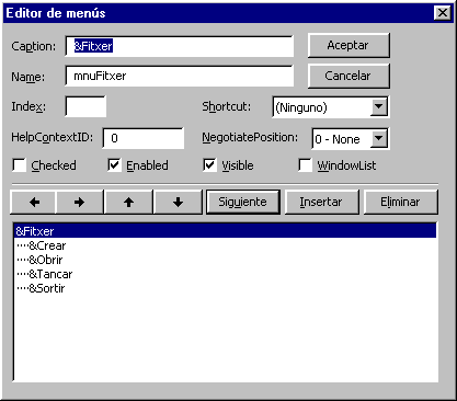 Les opcions de menú, que creareu clicat amb el botó dret en el formulari i en el menú contextual que apareix escollireu la opció, Editor de menús... . ![]() ![]() són les següents:
