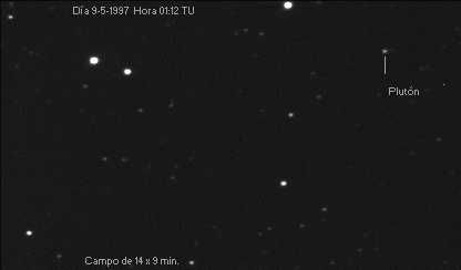 El dia 3 de maig de 1997 vam fotografiar el planeta Plutó amb el telescopi newton de 310 mm de diámetre i una càmera CCD acoblada. Amb nou segons d'exposició la marca lluminosa del planeta ja era visible com una feble estrella, pero vam allargar l'exposició fins a 50 segons per fer visibles altres estrelles del camp, que té 14 per 9 minuts d'arc.
