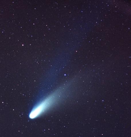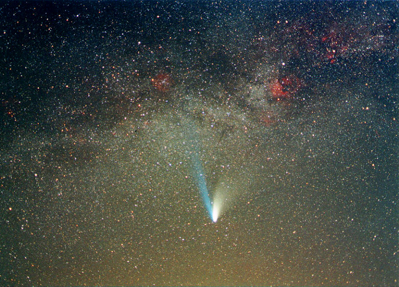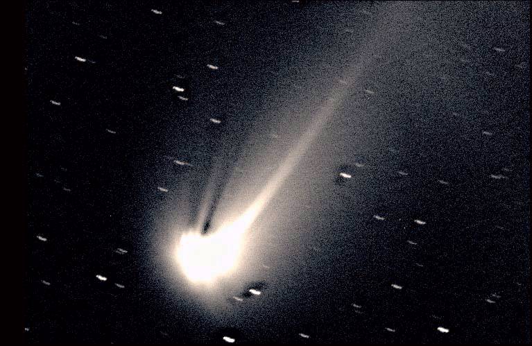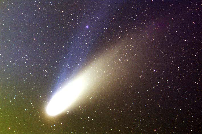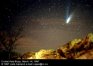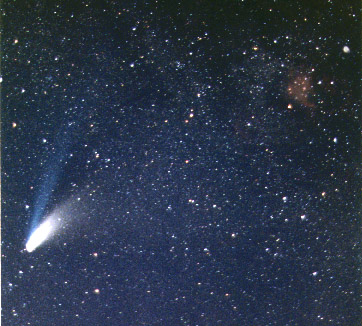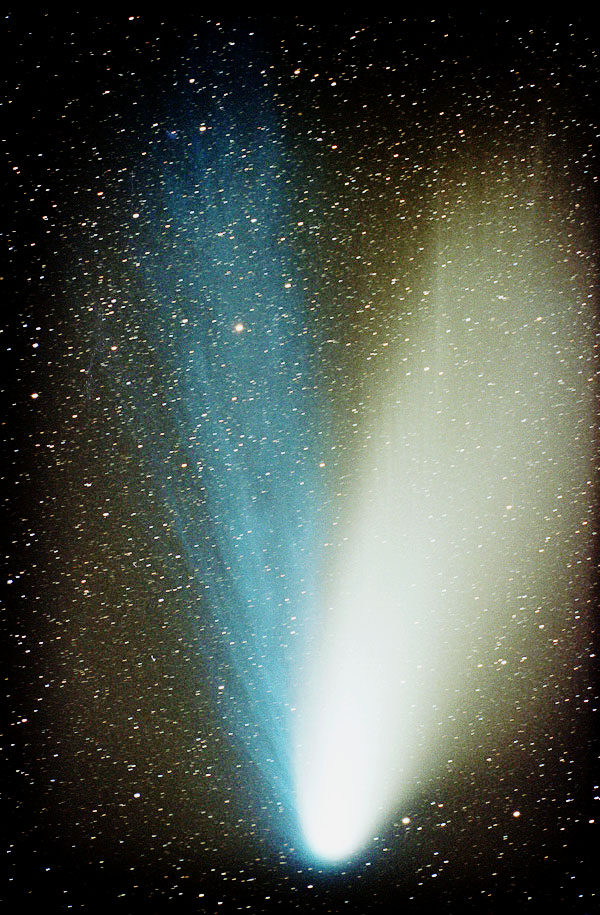 D'Arsiè and Gabriele Rosolen Localitat: Passo Giau (2230 mt), Cortina d'Ampezzo (Italy) Equip:Takahashi FS 102 f/6 - Kodak Gold 400 II hiper. 6 minuts d'exposició. La coma del cometa tenía magnitud - 0.6, amb una cua iònica que a ull nu tenia uns 15 g. de llarg i una cua difusa de pols d'uns 7 graus. |