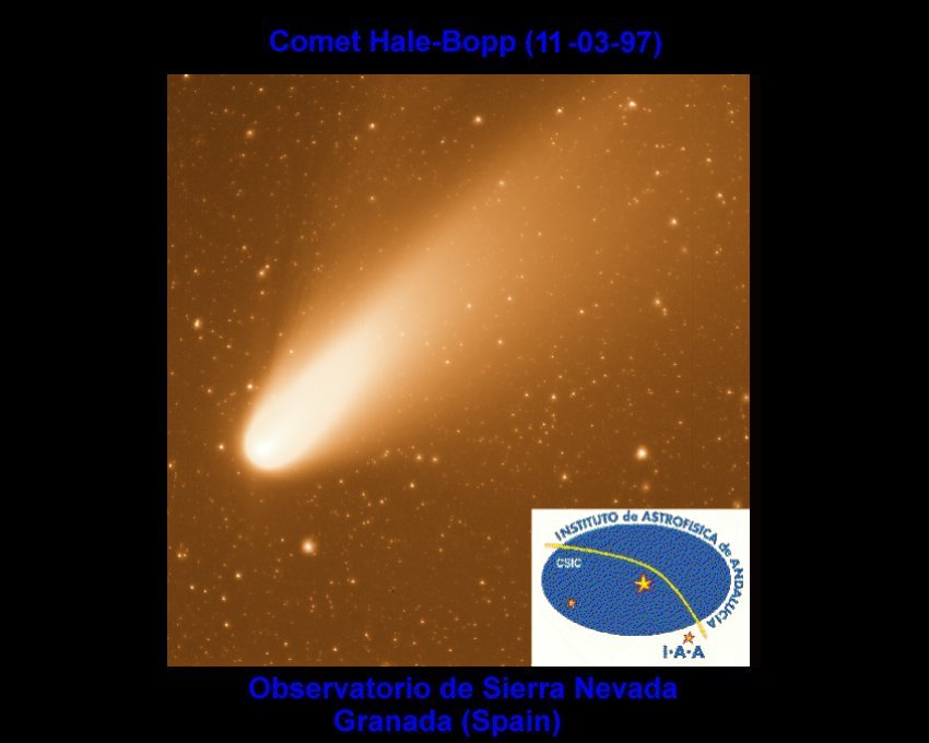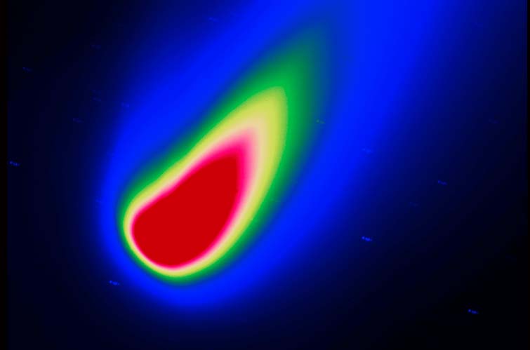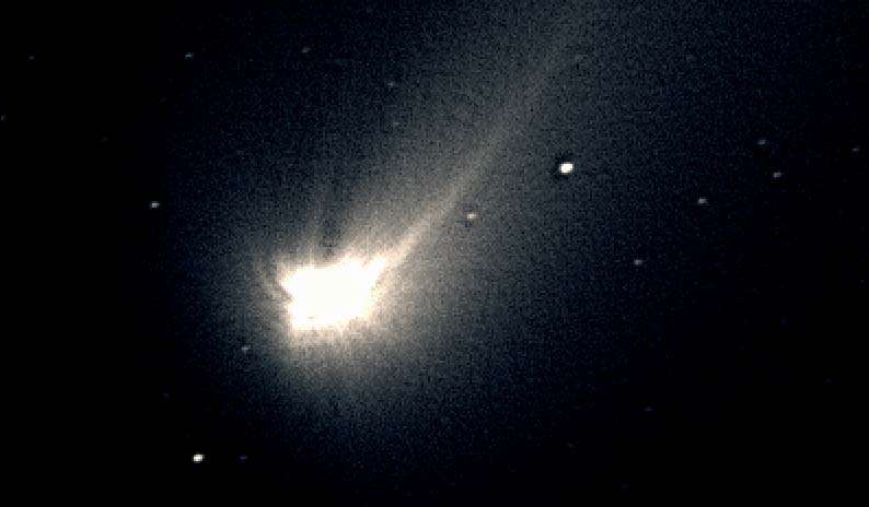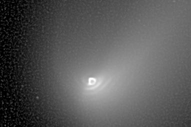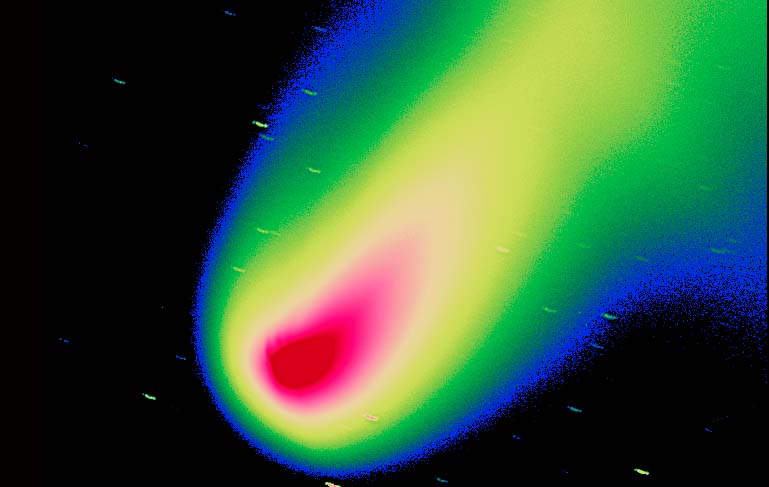 Autors: José Luis Ortiz, Ernesto Sánchez-Blanco Localitat: Observatorio de Sierra Nevada, Instituto de Astrofisica de Andalucia, CSIC. Granada Equip: objectiu 300mm f/5,6. Càmera CCD 1024x1024. La part interior de la coma s'ha sobreexposat i s'ha emprat una paleta logarítmica perquè es vegi bé la cua. |