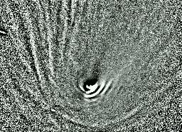 Autor: Steve Larson i Carl Hergenrother Localitat: Steward Observatory Equip: telescopi 2,3 m. Aquesta espectacular imatge [JPG; 26k] és una mostra reduida de l'original, que trobareu a http://www.lpl.arizona.edu/bss/HB0315CO.html. Mostra la llum emessa pel CO+. Les bandes que hi ha prop del nucli són degudes a la pols, però les complicades ones de les zones exteriors corresponen als ions CO+ arrossegats cap a la cua pel camp magnètic del vent solar. Aquestes estructures canvien de forma apreciable en questió de minuts. El nord és cap a la part superior i l'est a l'esquerra. El camp abastat és d'uns 350.000 km a la distància a la que es troba el cometa. |