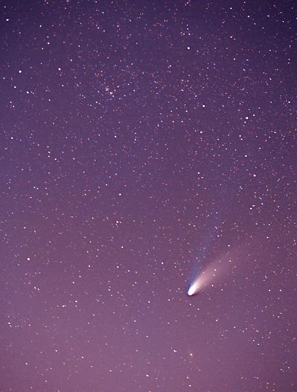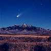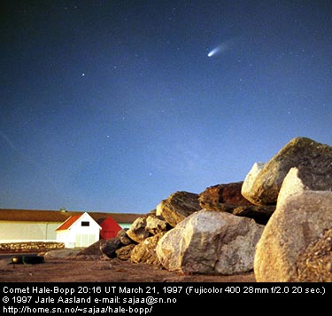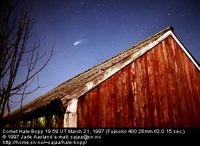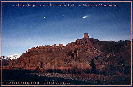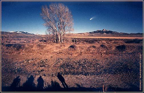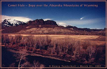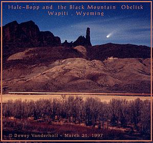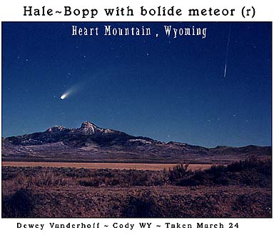 Autor: Dewey Vanderhoff Lugar: Wapiti Valley, al oeste de Cody Wyoming, cerca de Yellowstone Park. Equipo: 55mm f/2.8 y Fuji Super G-400 (película negativa en color). Otra foto distinta. Coincidió con la caída de un bólido, que se extinguió con un destello. La montaña es Heart Mountain, un lugar famoso a unos 13 lm al norte de Cody, Wyoming, cerca de la frontera con Montana. Actualmente, desde el norte de Wyoming, el Hale Bopp sólo está bajo el horizonte durante unas dos horas en su rotación circumpolar. |