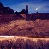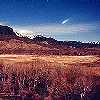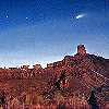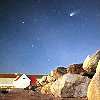 Autor: Dewey Vanderhoff Lugar: Wapiti Valley a l'oest de Cody Wyoming, prop de Yellowstone Park. Equipo: objetivo 35mm f/2 a 2.8 y Fuji Super G-800. Aproveché la luz de la Luna para iluminar el paisaje. El tiempo de exposición ha de ser suficientemente corto para que las estrellas salgan como puntos. Estas condiciones sólo se dan 2 o 3 dias cada mes, alrededor de la luna llena. Con película de 400 y f/2,8 va bien una exposición de 40 a 60 segundos. Mis fotos están hechas con una cámara Nikon, objetivos de 24, 35 y 55 mm y trípode. La composición, a ciegas, con mucha suerte y según lo que recuerdo del paisaje. Ya me voy arreglando después de veinte años intentándolo. Cuando la Luna está alta las hago con 40 segundos, y cuando está baja, con 60. Para encuadrar hay que actuar como un cazador de patos medio ciego. Mis fotos recuerdan el estilo de los grandes paisajistas que pintaron el oeste americano en el siglo pasado: más bien impresionistas. Espero que os parezcan un buen complemento a todas esas imágenes del cometa que parecen trofeos de Daniel Boon o David Crockett. |