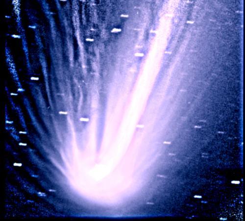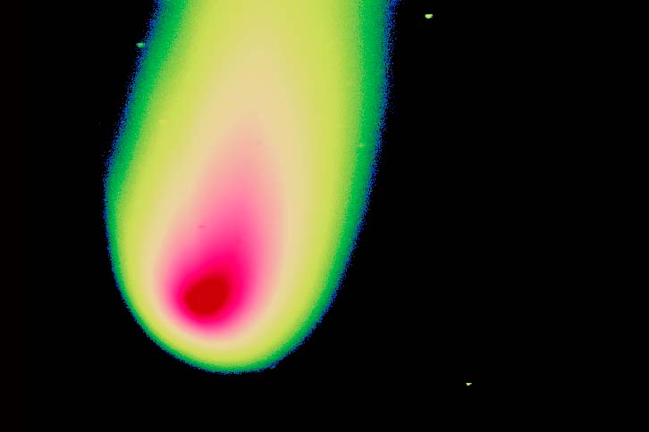 Puckett Equipo: telescopio reflector 30cm f/6. Cámara CDD Apogee AP-7. Imagen en falso color del Hale-Bopp obtenida a partir de 20 exposiciones de 15 segundos. La primera se tomó a las 00:51:38 UT, y la última a las 01:05:07 UT. Procesada para que se vean los chorros del núcleo. Copyright©1997 Tim Puckett |