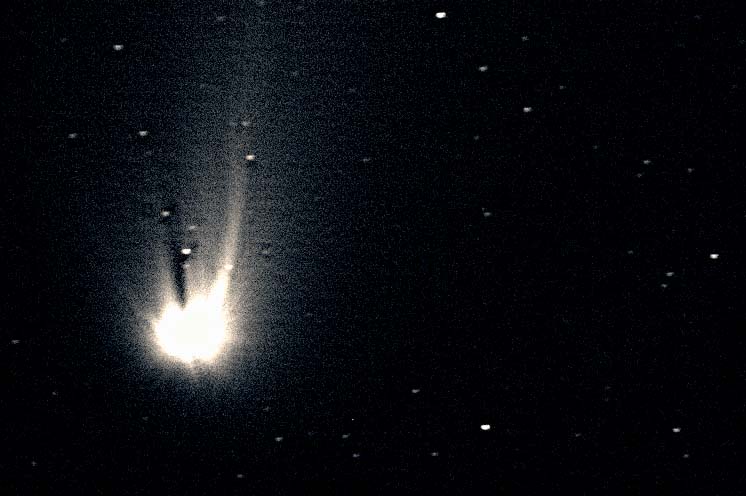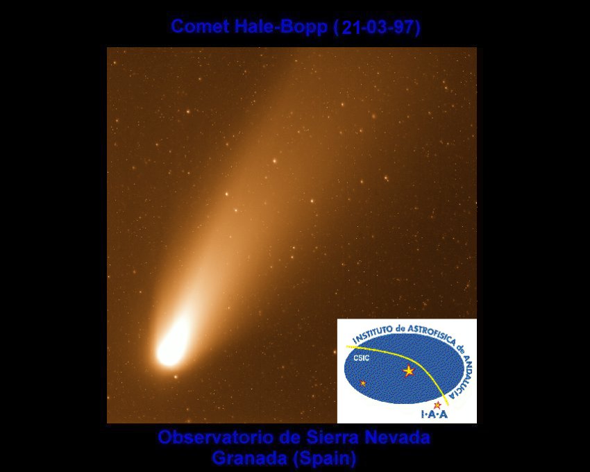 Autores: José Luis Ortiz, Ernesto Sánchez-Blanco Lugar: Observatorio de Sierra Nevada, Instituto de Astrofisica de Andalucia, CSIC. Granada (Spain) Equipo: objetivo 300 mm f/5.4. Cámara CCD 1024x1024. Campo visual: 2.4 x 2.4 grados. El norte está hacia la parte superior y el oeste a la derecha. La parte central de la coma se saturó para que se viese mejor la cola. |