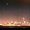 Autor: Joseph Sivo Lugar: Jersey City, New Jersey Equipo: Pentax K-1000 con objetivo 50mm f/2.8. Película Kodak 400 ASA Royal Gold. 15 segundos de exposición sin seguimiento, digitalizada a 200 dpi y procesada. Esta foto del cometa Hale-Bopp sobre Nueva York se tomó desde la orilla del rio Hudson, en el lado de New Jersey. El Empire State Building se ve a la derecha, y el puente George Washington a la izquierda. |