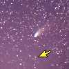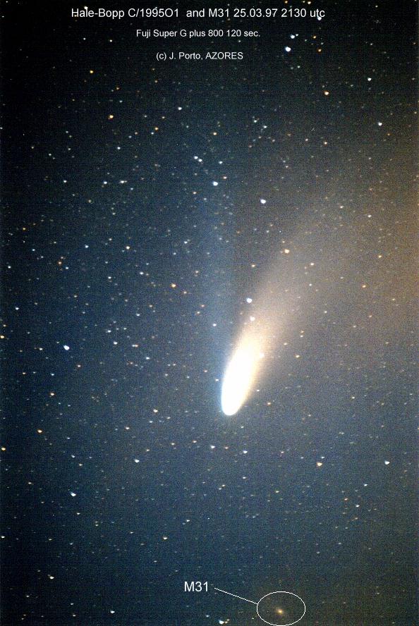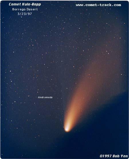 Autor: Bill Hutchinson (hutch@corecom.net) Lugar: Kenai National Wildlife Refuge, Alaska Equipo: Nikon N90 50mm f2, 25 segundos exposición con Fuji 800HG. Justo antes de que saliese la Luna se veía claramente el Hale-Bopp sobre la Vía Láctea. La flecha amarilla indica la posición de la galaxia de Andrómeda.