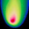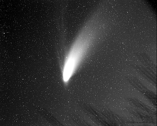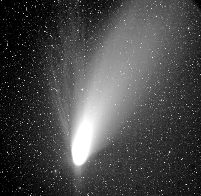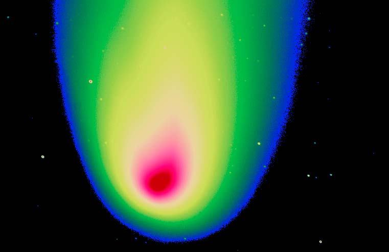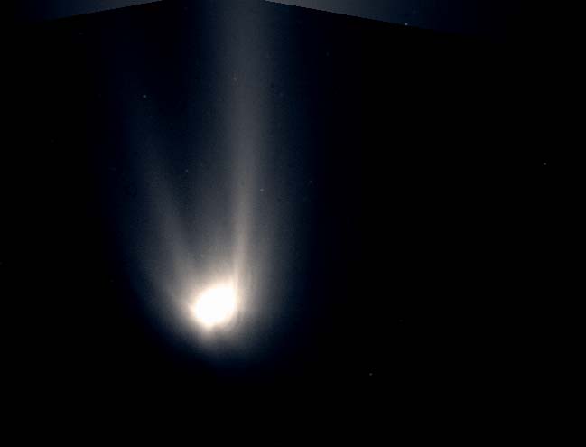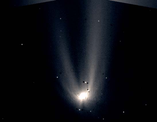 Ian Griffin Localitat: Astronaut Memorial Planetarium & Observatory, Cocoa (Florida) Equip: telescopi Maksutov 12" f/5 i càmera SBIG ST8. Filtre blau. La primera imatge és una exposició de 3 minuts del cometa Hale-Bopp. La resolució és de 18 micres per pixel. Camp de visió de 0,3 x 0,2 graus. Imatge processada per mostrar l'estructura de la coma. |